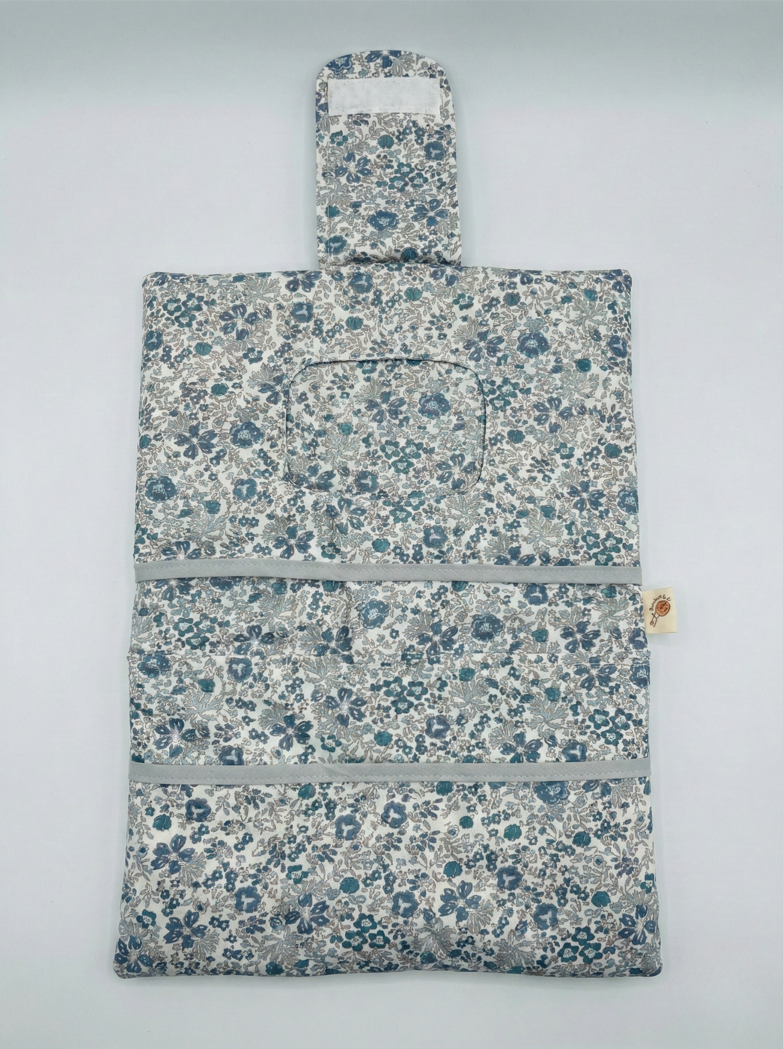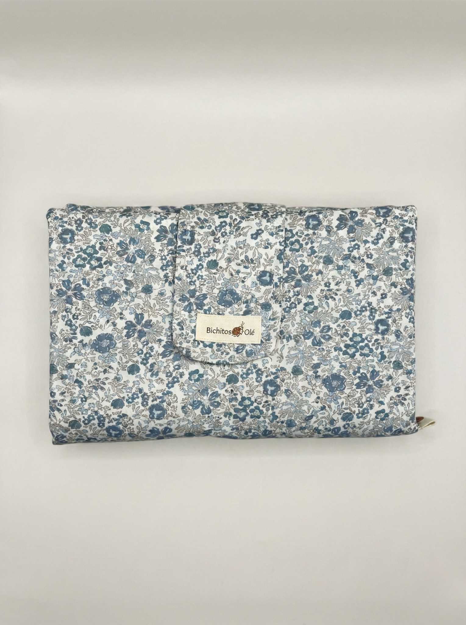 Organizador de cambio y portatoallitas 2 en 1 de Bichitos Olé. Diseño desplegable en tela azul con estampado botánico. Incluye dispensador de acceso rápido para toallitas y compartimentos extra para pañales y cremas. Cierre de velcro, compacto y lavable. Ideal para el paseo.