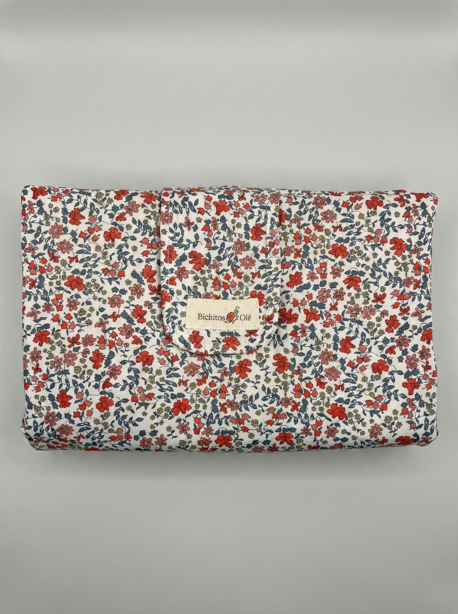 Organizador de cambio y portatoallitas 2 en 1 de Bichitos Olé. Diseño desplegable en tela azul con estampado botánico. Incluye dispensador de acceso rápido para toallitas y compartimentos extra para pañales y cremas. Cierre de velcro, compacto y lavable. Ideal para el paseo.