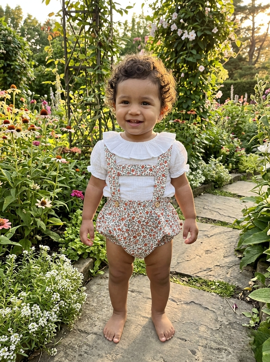 Elegancia dulce para los días de sol. Ranita de algodón con un exclusivo diseño tipo H en el pecho y botones en la espalda para vestir al bebé con facilidad y estilo.