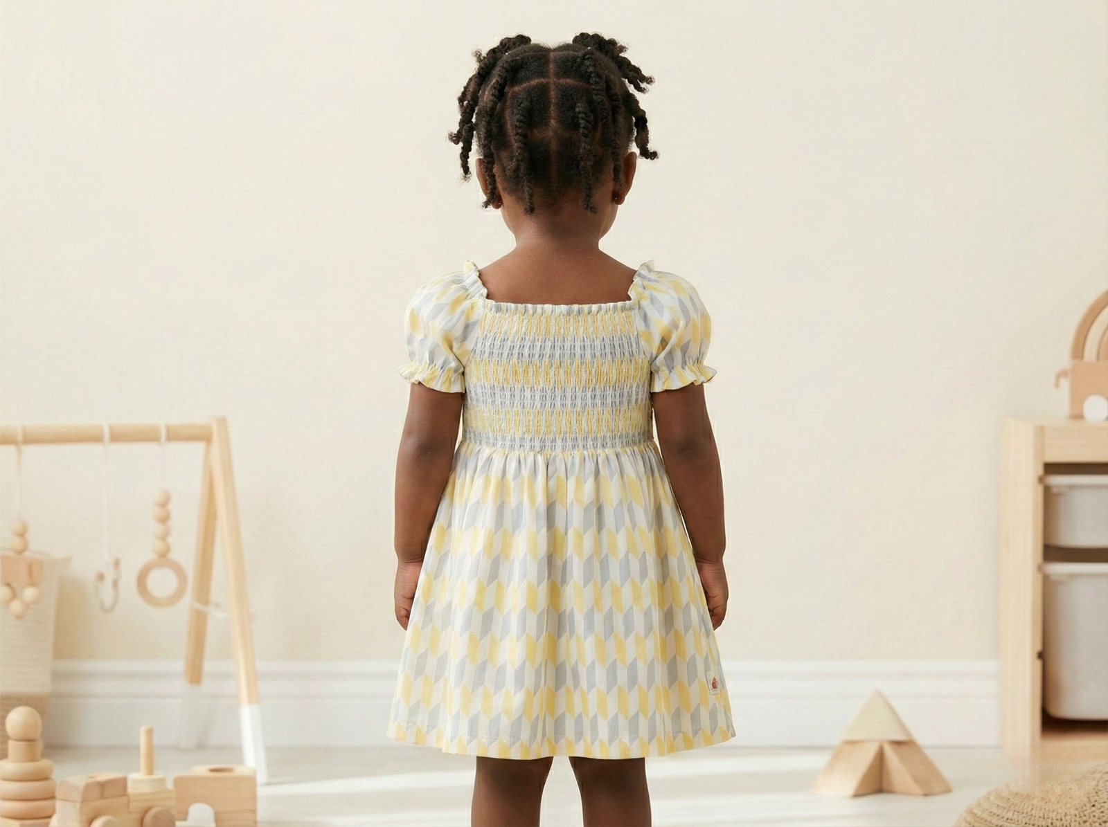 Alegre vestido de niña con moderno estampado geométrico de rombos en tonos amarillos y grises. Su cuerpo elástico en nido de abeja garantiza un ajuste perfecto y total comodidad para jugar todo el día.